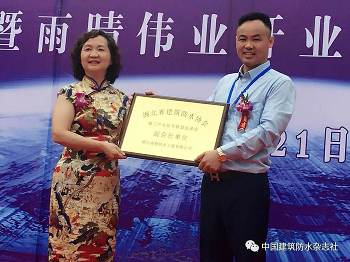 隨后,湖北防水協會會長桂春芳女士代表湖北防水協會在開業慶典大會上發表重要講話,她對湖北雨晴由最開始的施工企業轉型為防水系統服務商的工程進行了簡要介紹,并對之前雨晴承接的眾多國家大型、重點項目的防水工程予以肯定,并對雨晴在湖北乃至華中地區較高知名度,美譽度,影響力予以了肯定。她還說:當前,高質量發展是新時代的要求,也是防水行業新時代的使命,并希望雨晴集團在產品質量、工程質量和服務質量的管理上進一步做深做透做細,日益精進。心無旁騖造產品、一絲不茍干工程、全心全意做服務,使雨晴集團快速進入高質量高效益發展的康莊大道。之后授予雨晴公司“湖北省建筑防水協會施工產業技術聯盟促進會副會長單位”。
